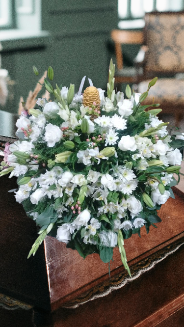 Hermoso cubre caja de rosas y variado de flores blancas, follaje para honrar a nuestros seres queridos como se merecen.