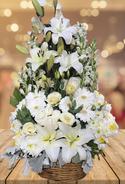Hermosa canasta grande floral para condolencias, reconforta y envía un mensaje a tus seres queridos ya sea en el velorio o a su domicilio para decirles unas palabras de amor en esos momentos que son cuando mas se necesitan.