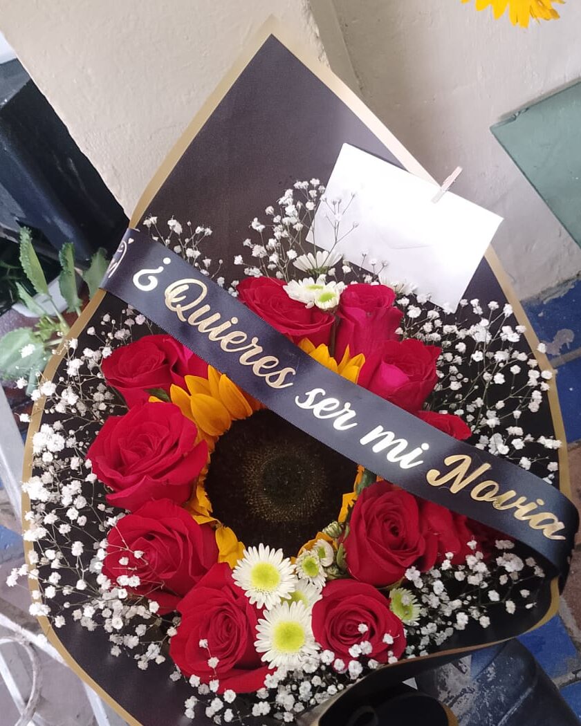 Hermoso ramo de una docena de Rosas con Girasol, un detalle para todo ocasión.———————————————————————-Si no requieres factura, ignora la siguiente nota. NOTA: El precio de este producto no incluye IVA, en caso de requerir factura favor de contactarnos antes de realizar tu compra, estaremos felices de ayudarte.